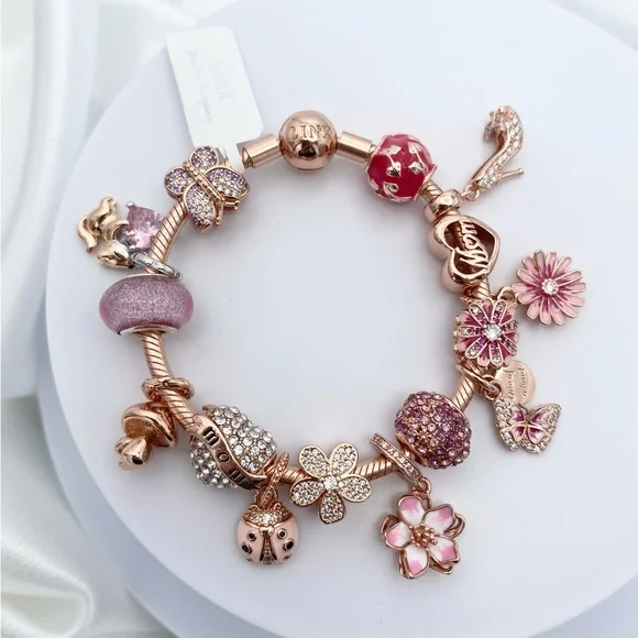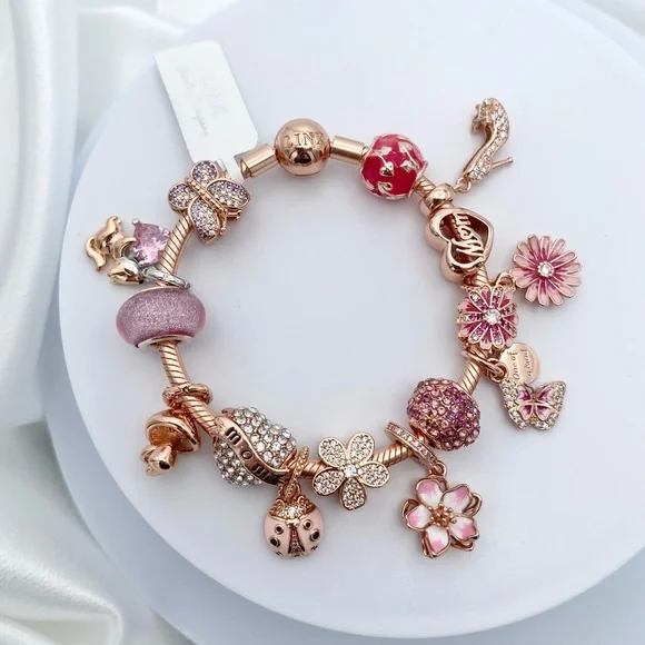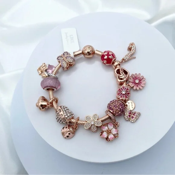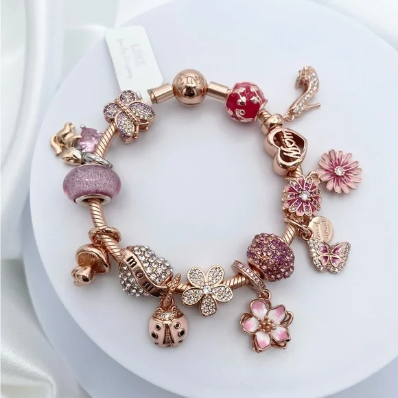 Linx Snake Chain style charm bracelet with a ball clasp, featuring Linx logo.The bracelet comes with 15 charms as shown.*All items are 925 sterling silver and 18k rose gold over 925 sterling silver.*Linx bracelets and charms are very well made and of superior quality, designed to last. These pieces come with a 100% satisfaction guarantee or your money back.*The bracelet is available in multiple sizes *Additional charms can also be added to the bracelet and the ones included are removable as well. *Linx bracelets and charms are universal meaning the charms can also be worn on most other standard size charm bracelets of different brands and most other charms of standard size will also fit on this bracelet.*All of our items are new, directly from our store and will be delivered in a Luxury, signature Pink, Linx velvet jewelry pouch.*Please add 1 in to the measurement of your wrist in order to allow room for your charms.